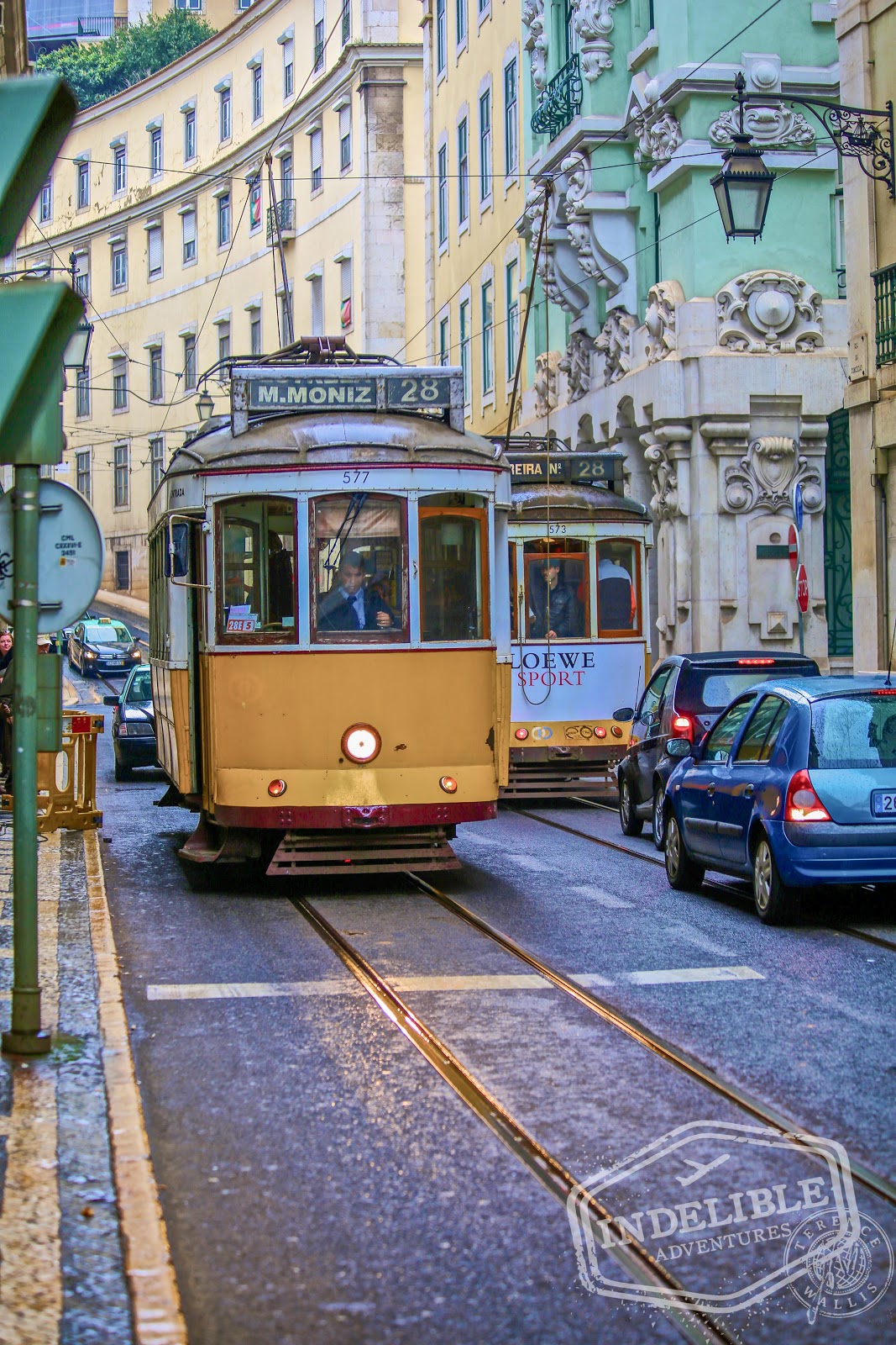 | Trams chugging up the hills in the Alfama district of Lisbon |